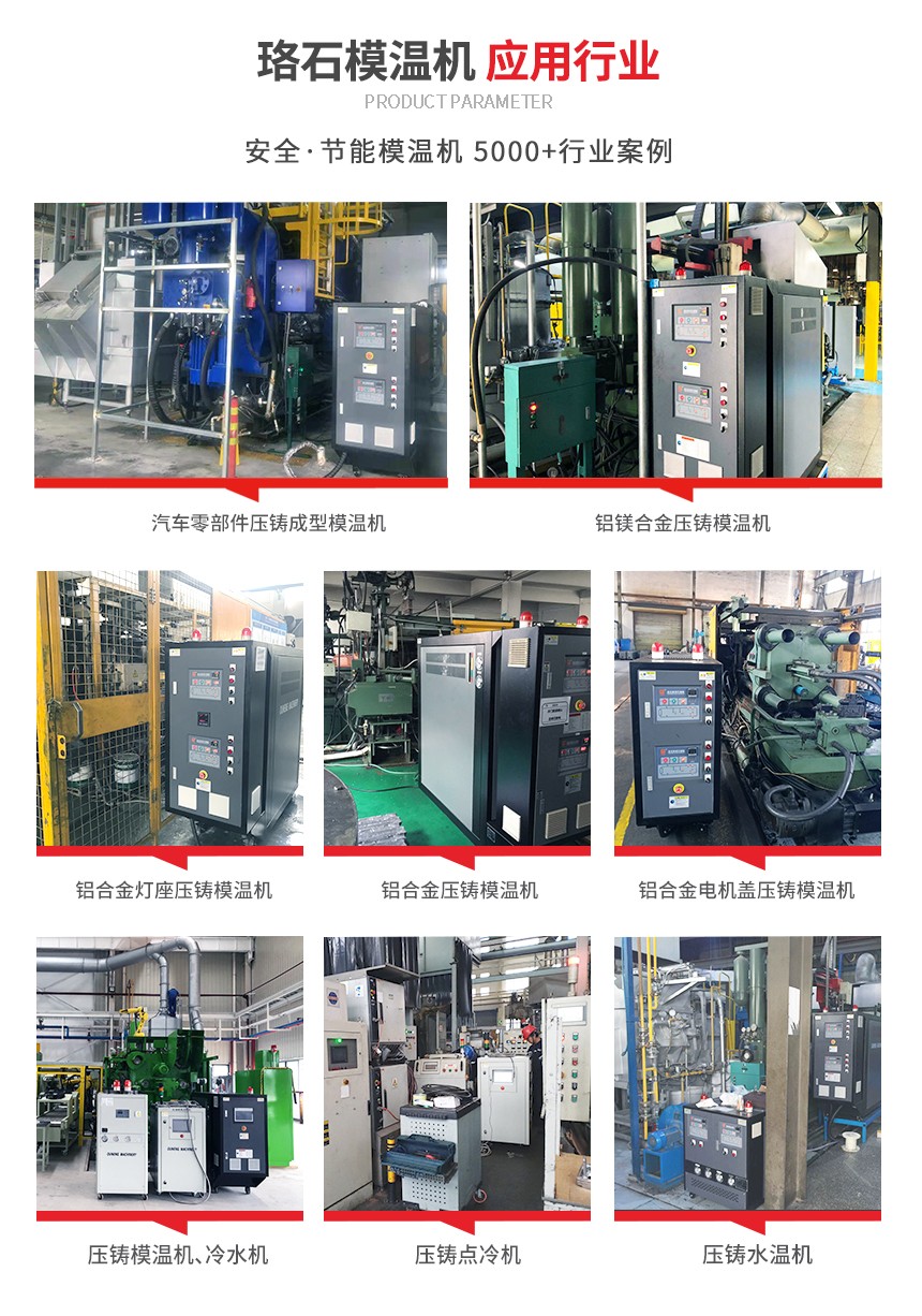 壓鑄行業(yè)使用壓鑄模溫機(jī)來(lái)提升工藝質(zhì)量、提高生產(chǎn)效率、改善壓鑄件質(zhì)量,使用壓鑄模溫機(jī)能夠有效地延長(zhǎng)壓鑄模具的使用壽命,節(jié)約企業(yè)成本。